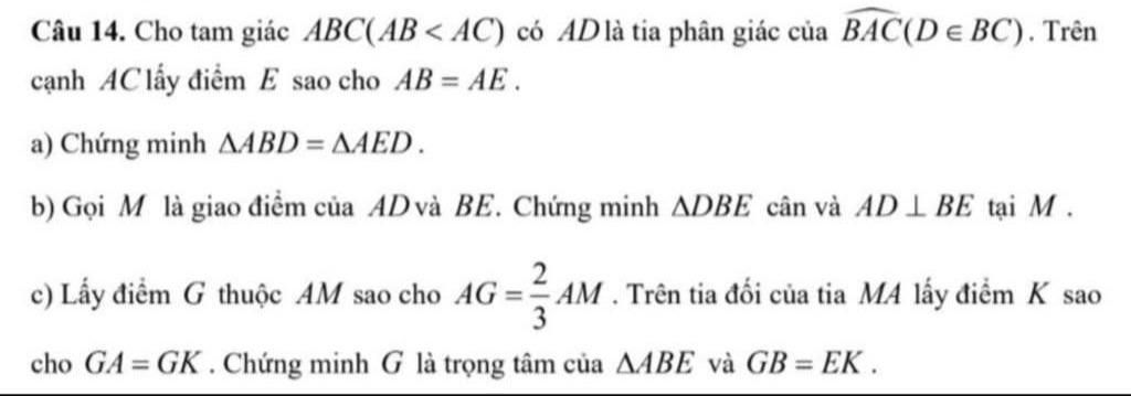 Câu 14. Cho tam giác ABC(AB < AC) có AD là tia phân giác của BAC(D ∈ BC). Trên