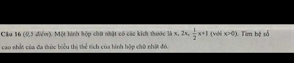 Vậy hệ số cao nhất của đa thức biểu thị thể tích của hình hộp chữ nhật là `:1`