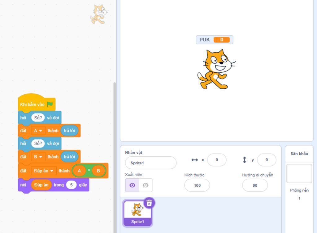 bạn tạo một chương trình scratch để nhân hai số nhập từ người dùng và hiển thị kết quả . Tuy nhiện khi bạn thử chương trình, nó không hiển thị kết quả đúng . Hãy mô tả cách bạn tìm lỗi và sửa chương trình
