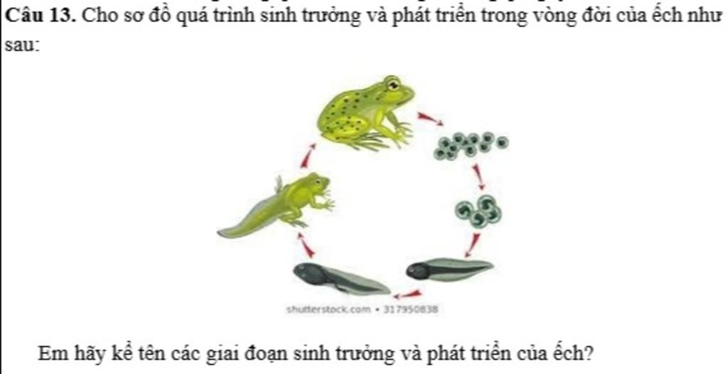 Trứng -> phôi -> nòng nọc 2 chân -> nòng nọc 4 chân -> ếch con -> ếch trưởng thành