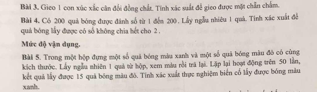 Bài 4. Có 200 quả bóng được đánh số từ 1 đến 200. Lấy ngẫu nhiêu 1 quả. Tính xác xuất đề