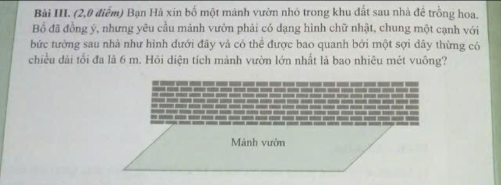 Diện tích lớn nhất của mảnh vườn là S = xy = 3 * 1,5 = 4,5 mét vuông