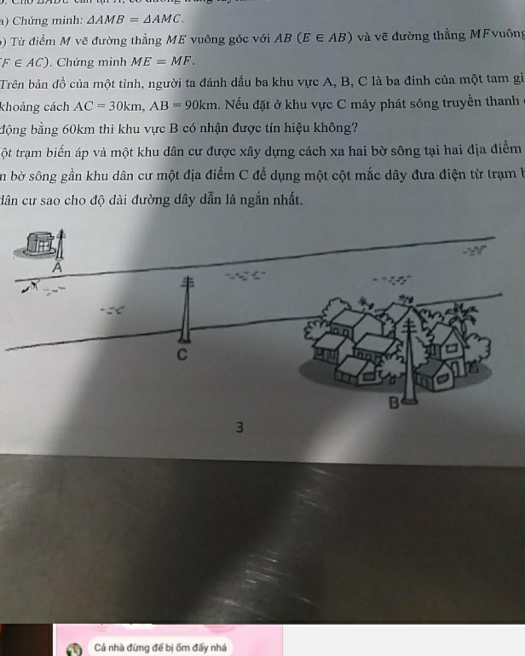 Câu 12. Một trạm biến áp và một khu dân cư được xây dựng cách xa hai bờ sông tại hai địa điểm A và B. Hãy tìm trên bờ sông gần khu dân cư một địa điểm C để dụng một cột mắc dây đưa điện tử trạm biến áp về cho khu dân cư sao cho độ dài đường dây dẫn là ngắn nhất.