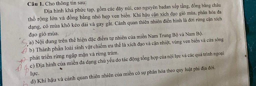 a. Đúng → Nội dung trên thể hiện đặc điểm tự nhiên của miền Nam Trung Bộ và Nam Bộ. Miền này có địa hình phức tạp với các dãy núi, cao nguyên, đồng bằng châu thổ rộng lớn và đồng bằng nhỏ hẹp ven biển, cùng khí hậu cận xích đạo gió mùa.
