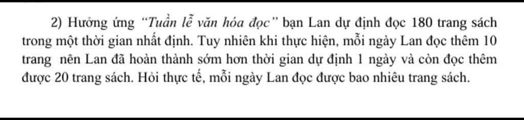 Gọi x là số trang sách mà Lan đọc mỗi ngày theo thực tế (x thuộc N*, trang sách)