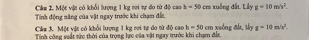 Câu 3. Một vật có khối lượng 1 kg rơi tự do từ độ cao h = 50 cm xuống đất, lấy g = 10 m/s2.