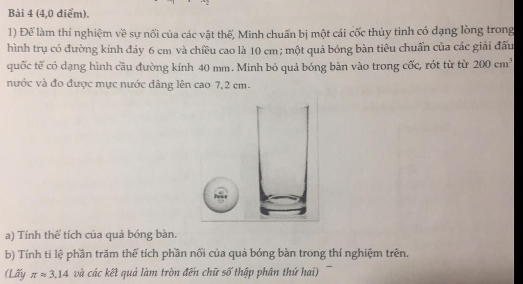 Sau khi thả quả bóng thì mực nước dâng lên `7,2 cm`