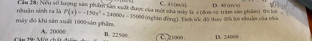 nhuận sinh ra là P(x)=−150x + 24000x – 35000 (nghìn đồng). Tỉnh tốc độ thay đổi lợi nhuận của nhà