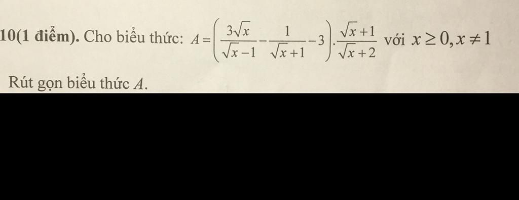 `A=((3\sqrt{x})/(\sqrt{x}-1)-(1)/(\sqrt{x}+1)-3).(\sqrt{x}+1)/(\sqrt{x}+2)` với `x>=0;x\ne1`