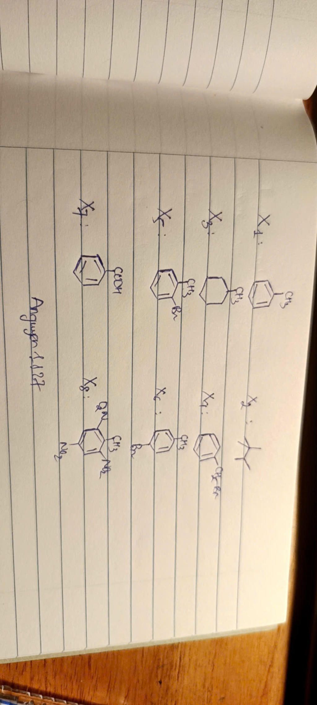 Thực hiện phản ứng reforming heptane, thu được hỗn hợp sản phẩm có chứa ba hydrocarbon X_{1} , X_{2} , X_{3} . Trong phân tử X_{l} có chứa vòng benzene, X_{2} là hợp chất no mạch hở có chứa một nguyên tử carbon bậc III và một nguyên tử carbon bậc IV. Hydrogen hoá hoàn toàn X_{1} thu được X_{3} Hợp chất X_{1} phản ứng với bromine trong điều kiện chiếu sáng thu được dẫn xuất monobromo X_{4} , còn trong điều kiện đun nóng với xúc tác iron(III) bromide thì thu được dẫn xuất monobromo X_{5} X_{6} Khi đun nóng X1 với dung dịch