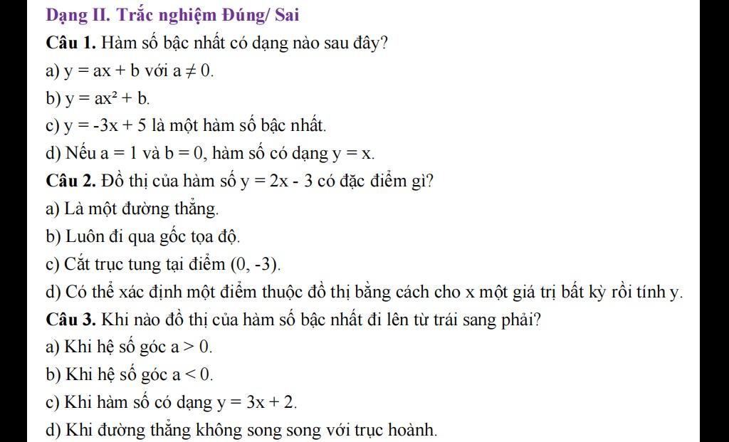 Câu 1. Hàm số bậc nhất có dạng nào sau đây?