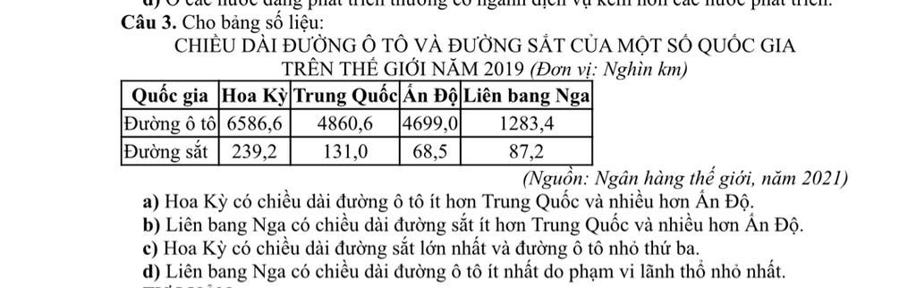 c. Đúng → Hoa Kỳ có chiều dài đường sắt lớn nhất (239,2 nghìn km) so với các quốc gia còn lại. Về đường ô tô, Hoa Kỳ đứng lớn nhất, không phải nhỏ thứ ba.