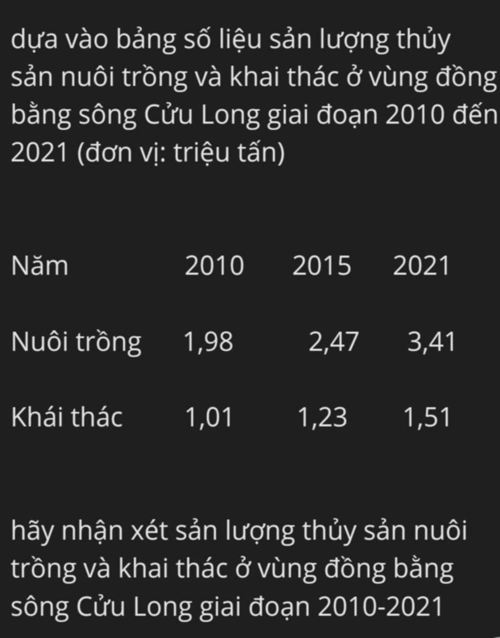 ⇒ Giai đoạn 2010 2021, ngành thủy sản ở Đồng bằng sông Cửu Long có xu hướng chuyển dịch mạnh sang nuôi trồng, giảm dần phụ thuộc vào khai thác tự nhiên.