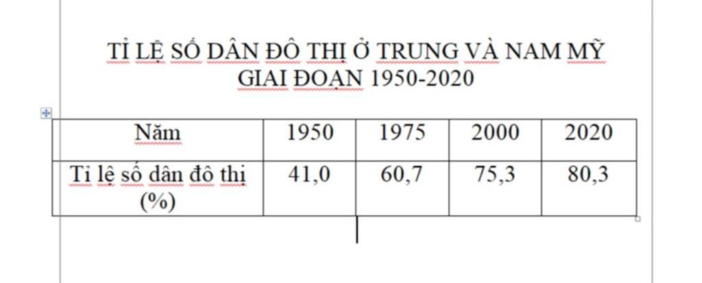 `-` Trong giai đoạn `1950 – 2020` , tỉ lệ dân cư đô thị ở khu vực Trung và Nam Mĩ tăng lên cao : từ `41,0%` (năm 1950), lên thành `80,3%` (năm 2020) và tăng `39,3%`