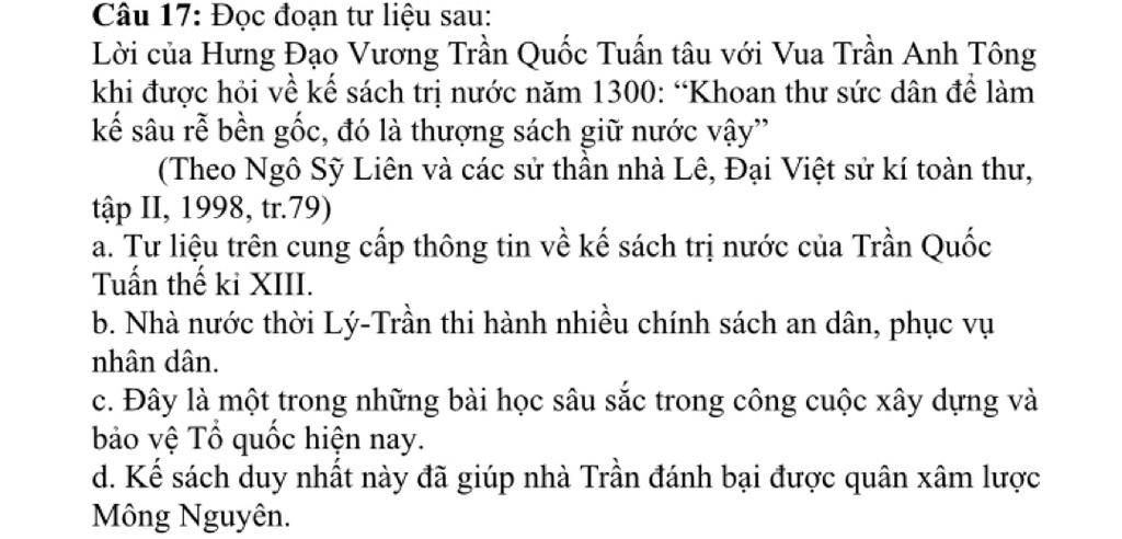 a. Đúng → Tư liệu trên cung cấp thông tin về kế sách trị nước của Trần Quốc Tuấn vào năm 1300. Ông đề xuất kế sách "Khoan thư sức dân để làm kế sâu rễ bền gốc" nhằm duy trì sự ổn định lâu dài của đất nước khẳng định tầm quan trọng của việc chăm sóc, bảo vệ sức khỏe và cuộc sống của nhân dân trong công cuộc trị quốc.