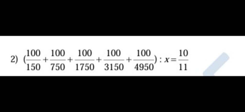 `(100/150 + 100/750 + 100/1750 + 100/3150 + 100/4950) : x = 10/11`