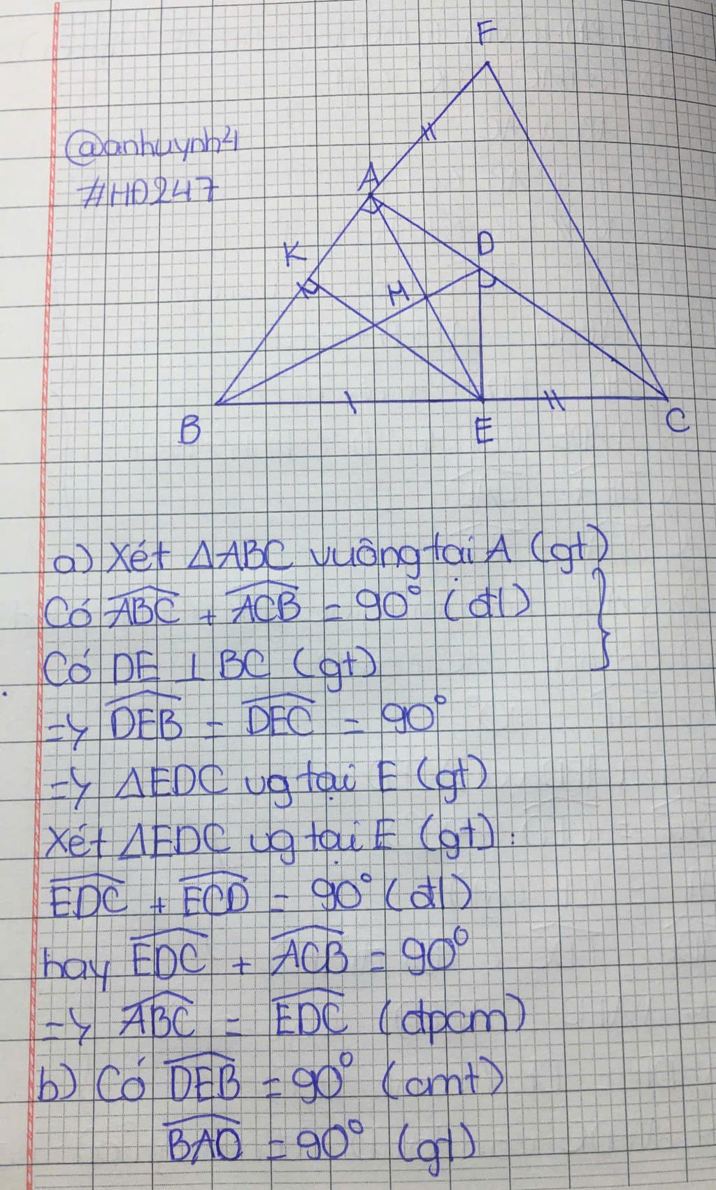 d) Từ E kẻ EK vuôn góc AB. CM: EA là tia phân giác góc DEK
