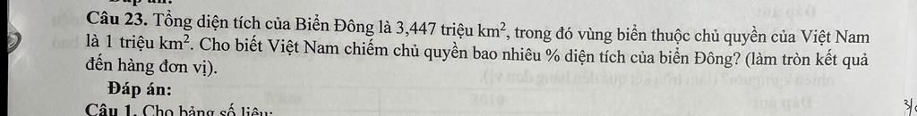 CT: Tỉ trọng `(%)=` Cá thể `:` Tổng thể `xx100`$\\$ Chủ quyền Biển Đông Việt Nam so với diện tích Biển Đông:$\\$ $\dfrac{1}{3,447}\times100\approx29(\%)$