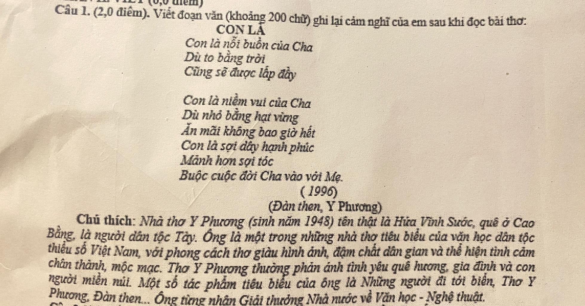 Câu 1. (2,0 điểm). Viết đoạn văn (khoảng 200 chữ) ghi lại cảm nghĩ của em sau khi đọc bài thơ.