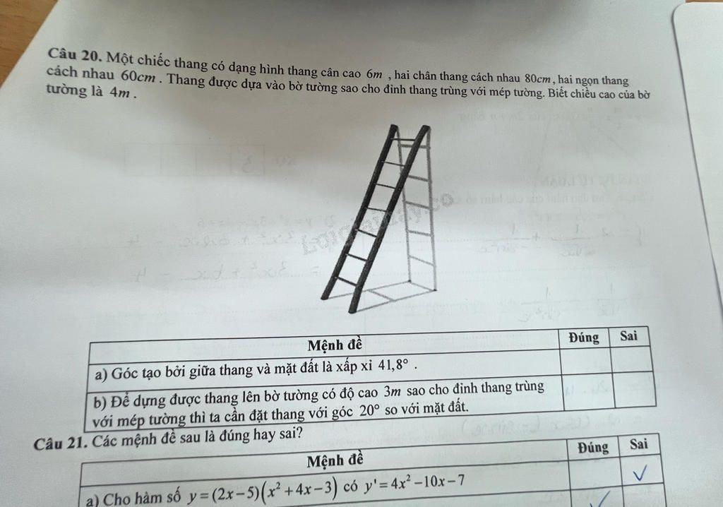 Câu 20. Một chiếc thang có dạng hình thang cân cao 6m, hai chân thang cách nhau 80cm, hai ngọn thang