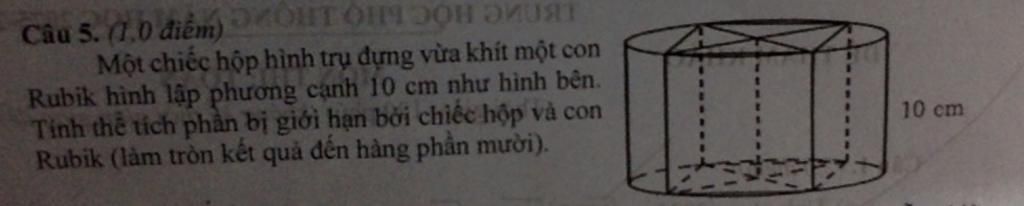 hình lập phương cạnh 10cm -> hình lập phương nằm trong hình trụ đáy hình trụ là hình tròn mặt đáy hình lập phương là hình vuông cạnh 10cm để hình vuông lọt vào hình tròn thì đường kính = đường chéo hình vuông đường chéo hình vuông có công thức `a\sqrt{2}` cạnh hình vuôn là `10cm` `->` đường chéo hình vuông `=10\sqrt{2}` Bán kính đáy hình trụ là : `10\sqrt{2} :2 = 5\sqrt{2} (cm)` Rút gọnhình lập phương cạnh 10cm -> hình lập phương nằm trong hình trụ đáy hình trụ là hình tròn mặt đáy hình lập phương là hình vuông cạnh 10cm để hình vuông lọt vào hình tròn thì đường kính = đường chéo hình vuông đường chéo hình vuông có công thức `a\sqrt{... xem thêm