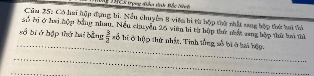 Chuyển `26` viên từ hộp `1` sang hộp `2` thì số bi hộp `2` gấp đôi hộp `1:`