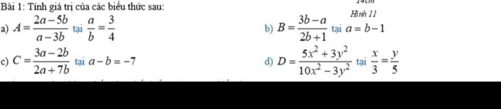 `A=(2a-5b)/(a-3b)=(2.3k-4k*5)/(3k-3.4k)=(6k-20k)/(3k-12k)=(-14k)/(-9k)=14/9`