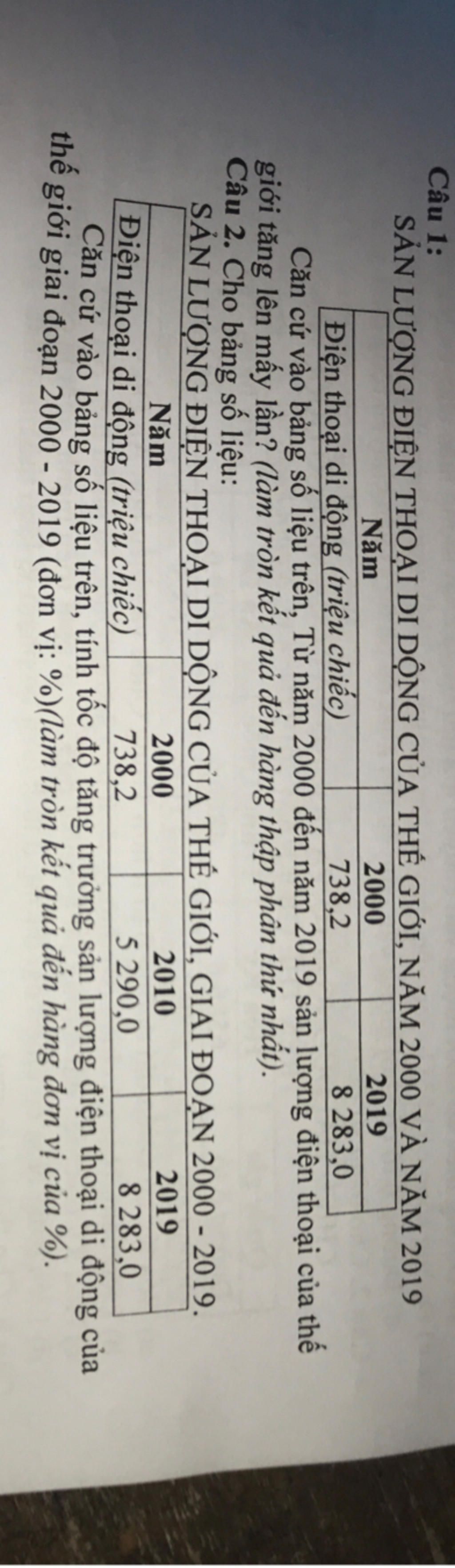 Câu `bb1`:$\\$ `color{red}{@\text{Chú ý}`: Muốn biết giá trị này gấp mấy lần giá trị khác ta chỉ cần lấy giá trị lớn chia giá trị bé.$\\$ `=>` Sản lượng điện thoại của thế giới giai đoạn `2000-2019` tăng:$\\$ $\dfrac{8\,283,0}{738,2}\approx11,2($lần$)$$\\$ Câu `bb2`:$\\$ `@` Lấy năm đầu `=100%`$\\$ `@` Tốc độ tăng trưởng $=\dfrac{\text{Giá trị năm cuối}}{\text{Giá trị năm đầu}}\times100$$\\$ $===========$$\\$`@` Lấy năm `2000=100%`$\\$ `=>`Tốc độ tăng trưởng sản lượng điện thoại di động của thế giới giai đoạn `2000-2019`:$\\$ $\dfrac{8\,283,0}{738,2}\times100\approx1\,122(\%)$