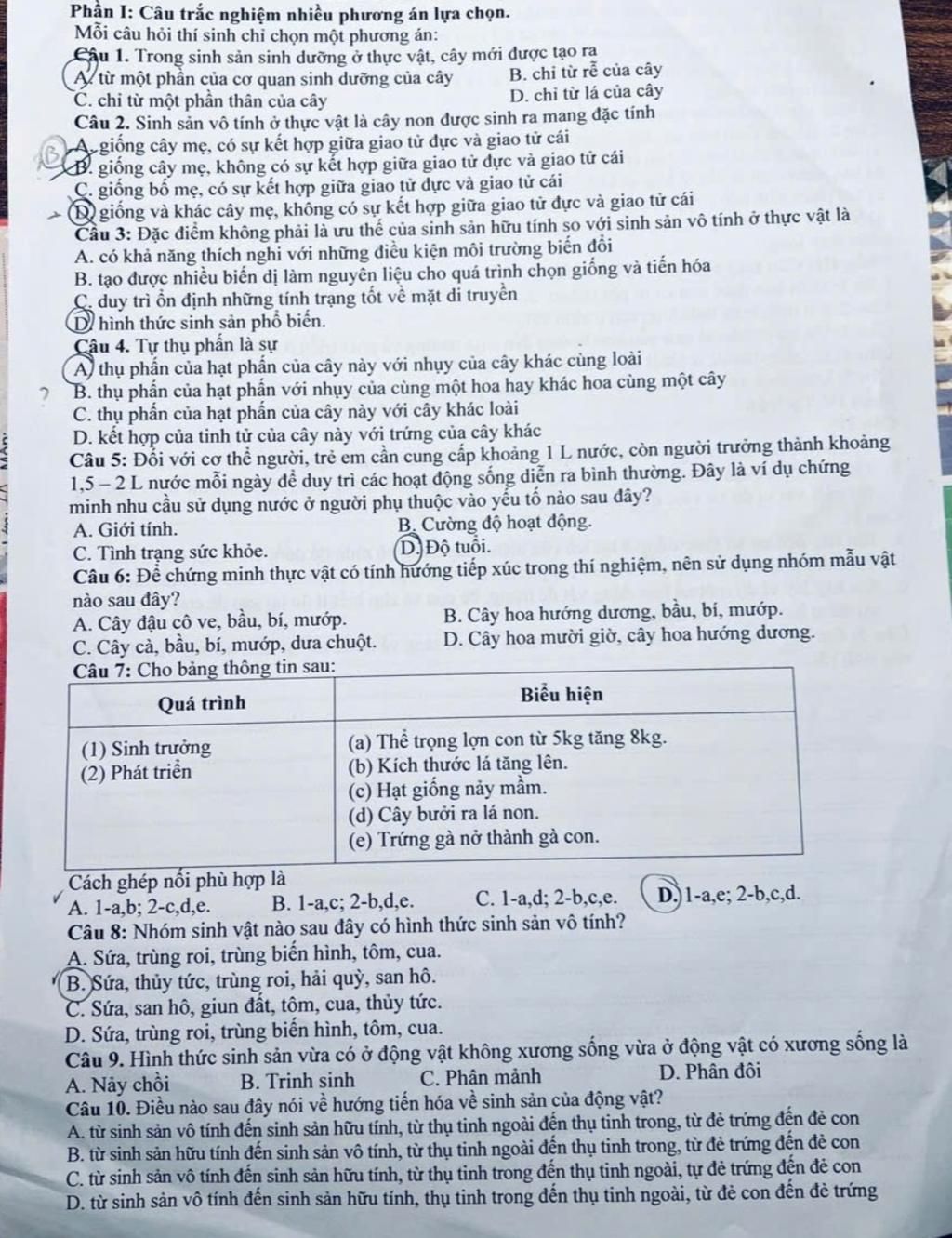 Câu 1. Trong sinh sản sinh dưỡng ở thực vật, cây mới