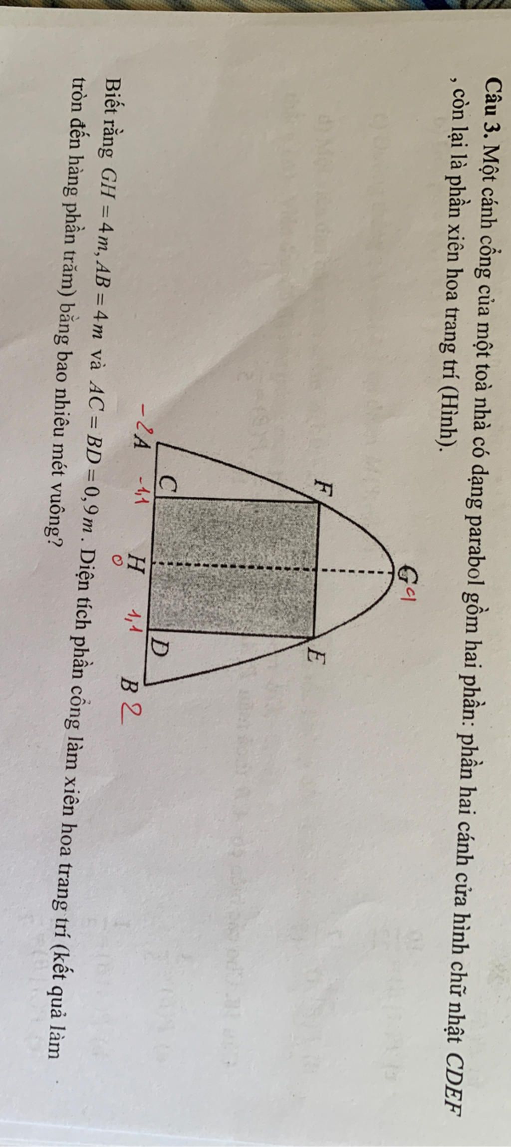 Câu 3. Một cánh cổng của một toà nhà có dạng parabol gồm hai phần: phần hai cánh cửa hình chữ nhật CDEF