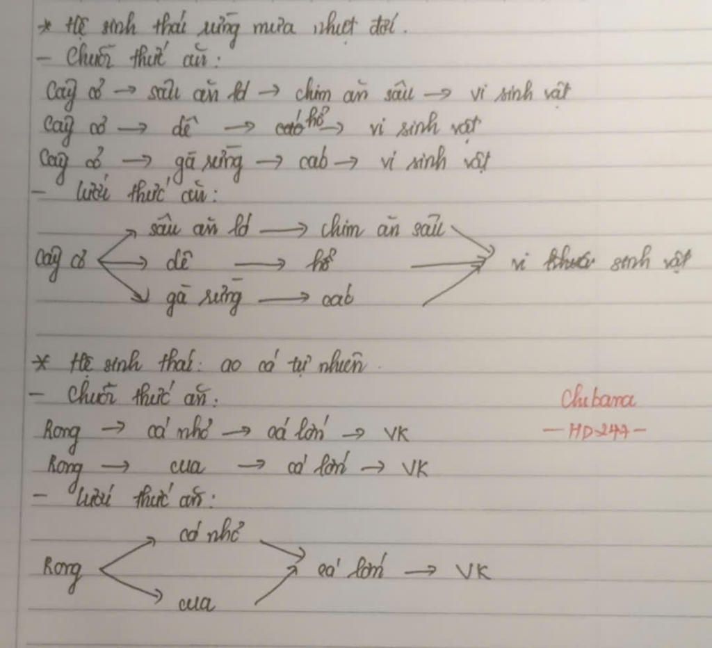 Lấy ví dụ về chuỗi và lưới thức ăn của quần xã trong hệ sinh thái rừng mưa nhiệt đới và ao cá tự nhiên? ( lấy ví du veef 1 lưới và 1 chuỗi,số lượng sinh vật tiêu thụ mắt xích phải nhiều hơn 5)