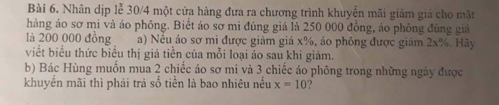 `a)` Số tiền mua áo sơ mi là: `250000-(250000.x%)(`đồng`)`