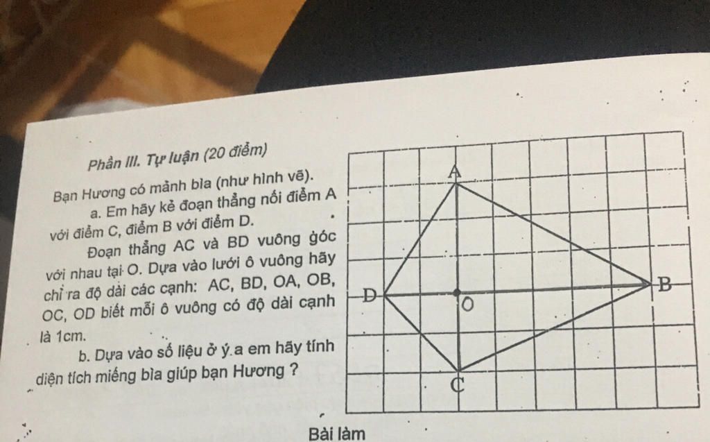 Miếng bìa có hình dạng tứ giác ABCD với hai đường chéo AC và BD vuông góc với nhau tại O. Diện tích của tứ giác có hai đường chéo vuông góc bằng một nửa tích độ dài hai đường chéo đó.