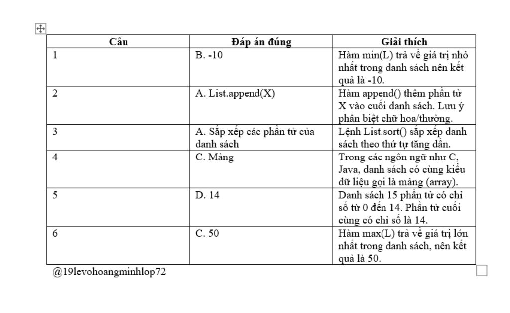 Câu 5: Trong Python, một danh sách gồm có 15 phần tử là các số nguyên thì phần tử cuối cùng có chỉ số phần tử là bao nhiêu?