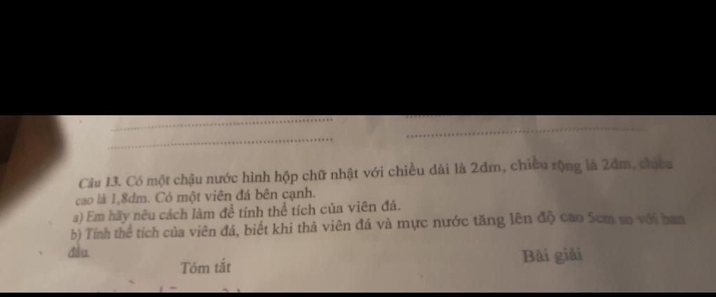 `a`. Cách tính thể tích của cục gạch là thả cục gạch vào chậu nước, nước tăng bao nhiêu thì đó là thể tích của cục gạch