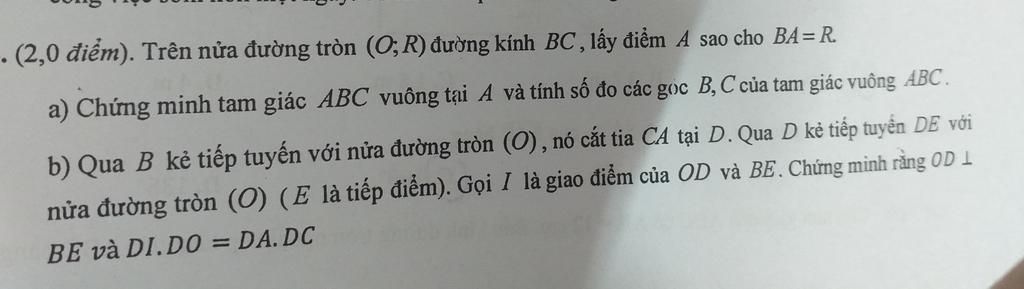 Câu 4 trên nửa đường tròn tâm O bán kính r cho đường kính BC lấy điểm a sao cho ba = r Chứng minh tam giác B AC vuông tại A và tỉ số đo các góc BC của tam giác vuông ABC b có B Kẻ tiếp tuyến với nửa đường tròn tâm O nó cắt tia AC tại D qua D kẻ tiếp tuyến de với nửa đường tròn tâm O E là tiếp điểm Gọi I là giao điểm của OD và Be Chứng minh rằng OD vuông góc be và di xbo = da nhân DC