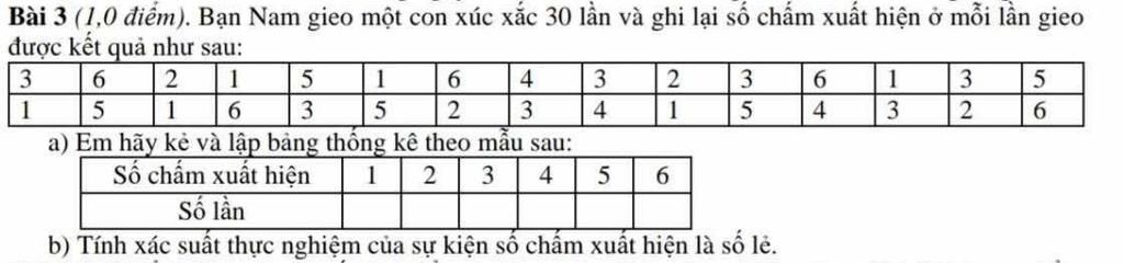 \begin{array}{|c|c|c|}\hline \text{Số chấm xuất hiện}&\text{1}&\text{2}&\text{3}&\text{4}&\text{5}&\text{6}\\\hline \text{Số lần}&\text{6}&\text{4}&\text{7}&\text{3}&\text{5}&\text{5}\\\hline\end{array}