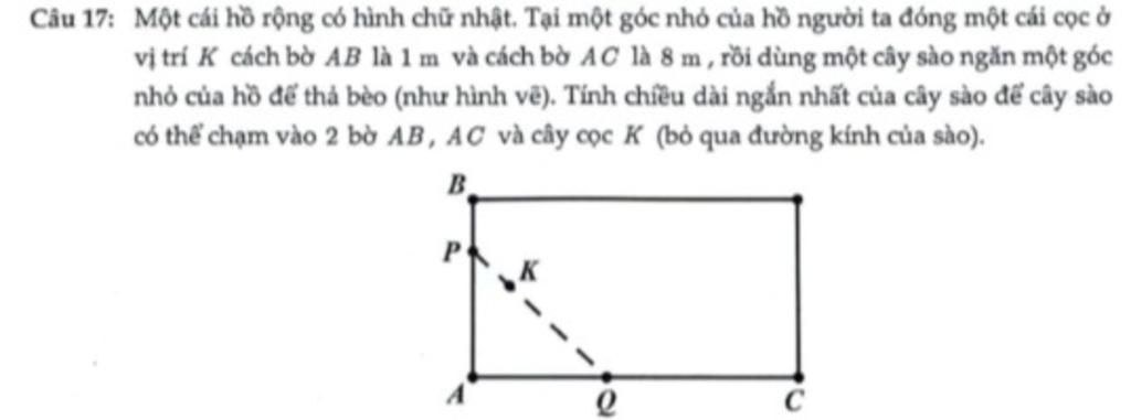Câu 17: Một cái hồ rộng có hình chữ nhật. Tại một góc nhỏ của hồ người ta đóng một cái cọc ở