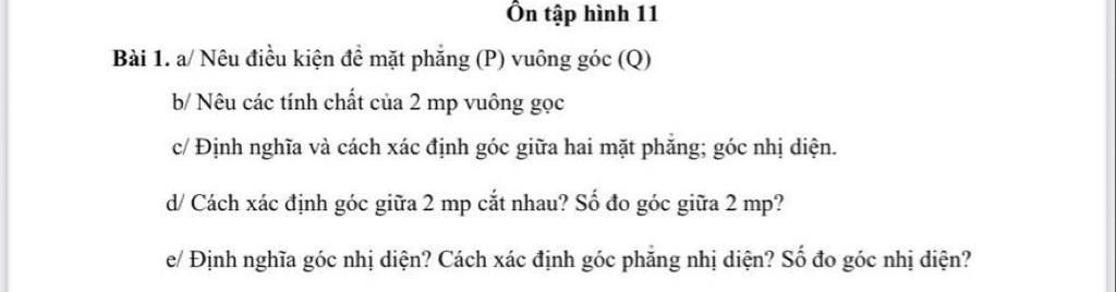 Bài 1. a/ Nêu điều kiện để mặt phẳng (P) vuông góc (Q)