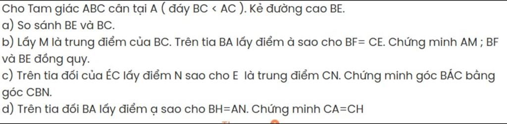 b) Lấy M là trung điểm của BC. Trên tia BA lấy điểm à sao cho BF= CE. Chứng minh AM ; BF