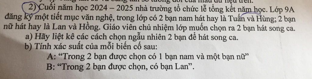 đăng ký một tiết mục văn nghệ, trong lớp có 2 bạn nam hát hay là Tuấn và Hùng; 2 bạn