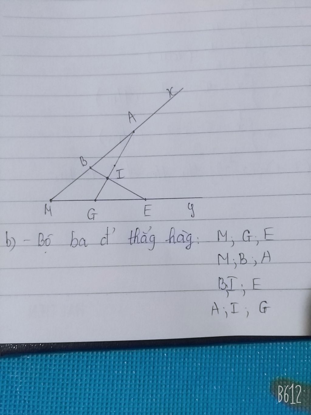 b) Vẽ điểm I là giao điểm của đoạn thẳng AG và đoạn thẳng BE . Kể tên các bộ ba điểm thẳng hàng trên hình
