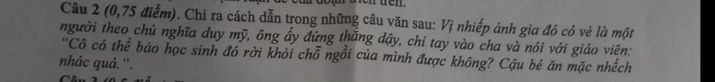Chỉ ra cách dẫn trong những câu văn sau : vị nhiếp ảnh gia đó có vẻ là 1 người theo chủ nghĩa duy mỹ ông ấy đứng thẳng dậy chỉ tay vào cha và nói với giáo viên:'cô có thể bảo học sinh đó rời khỏi chỗ ngồi của mình được không? Cậu bé ăn mặc nhếch nhác quá"