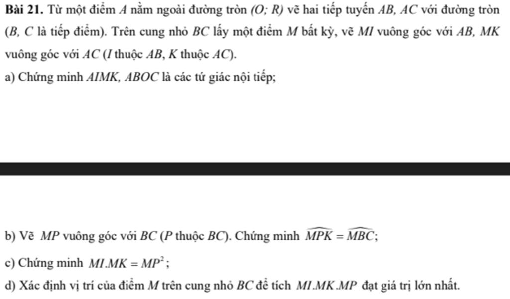 Vậy tích `MI.MK .MP` đạt giá trị lớn nhất khi M nằm chính giữa cung nhỏ `BC`.