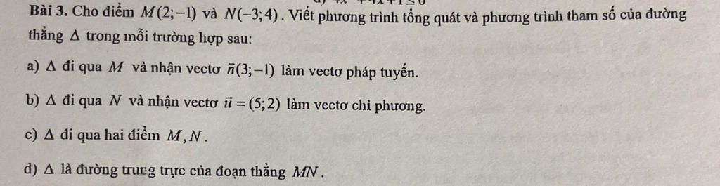 b) Δ đi qua N và nhận vectơ u = (5; 2) làm vectơ chỉ phương.