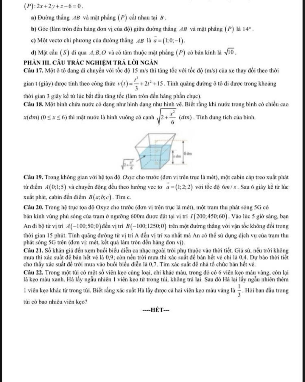 d) Mặt cầu (S) đi qua A,B,D và có tâm thuộc mặt phẳng (P) có bán kính ...