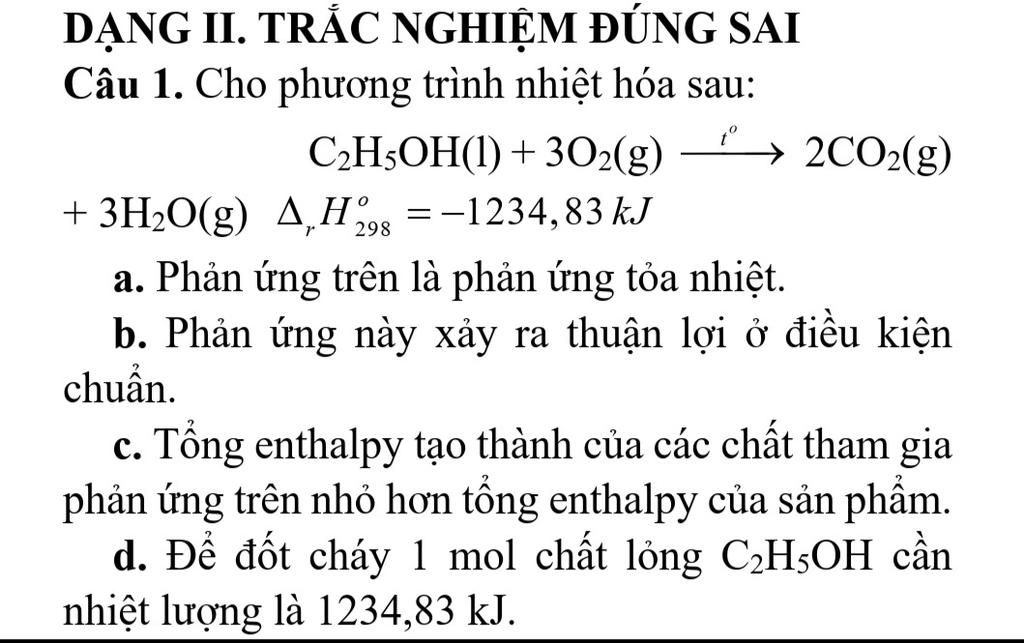 c, Sai. Vì đây là phản ứng toả nhiệt, nên $Δ_{r}$$H^{0}_{298 (sp)}$ `<` $Δ_{r}$$H^{0}_{298 (cđ)}$