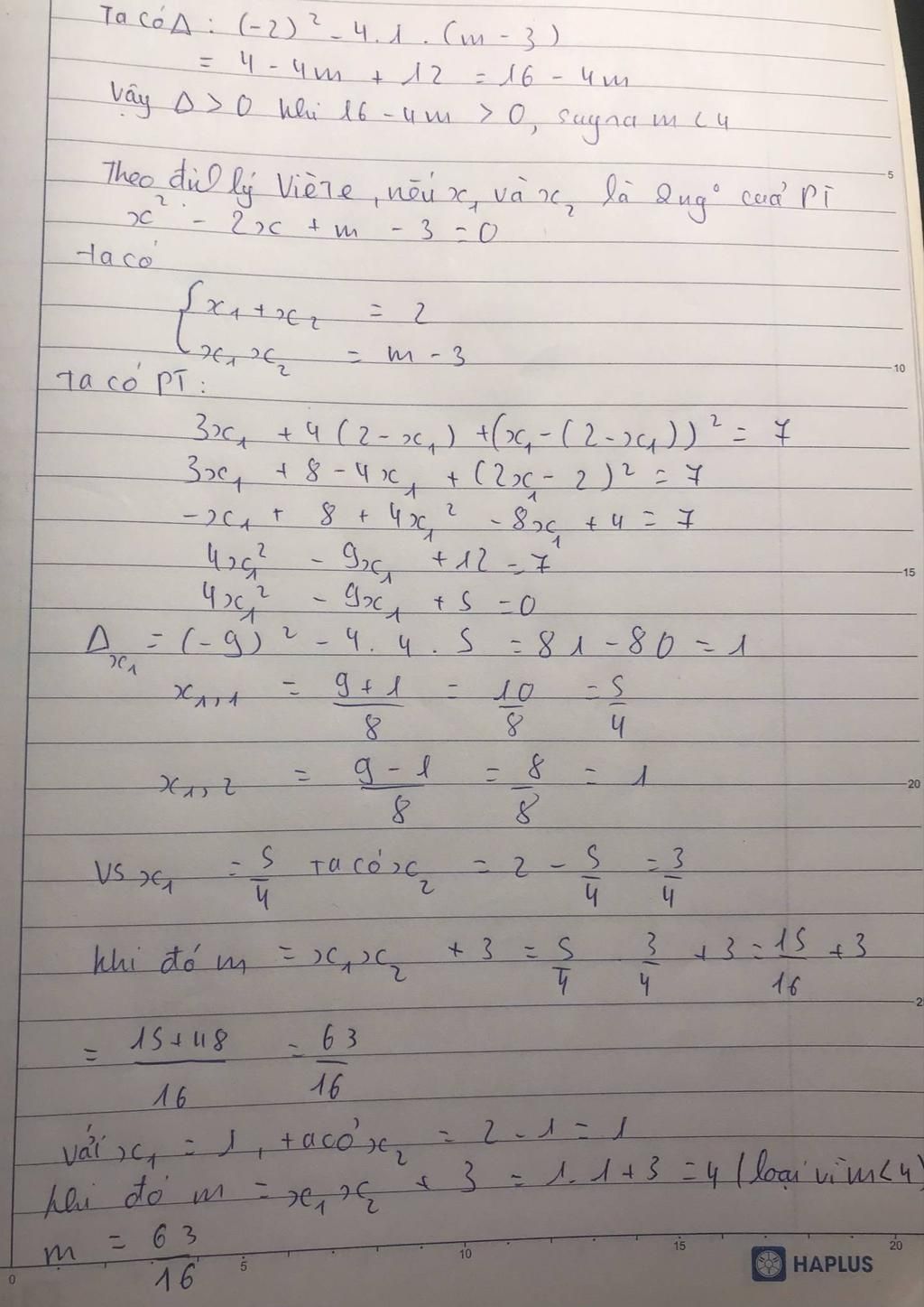 Tìm các giá trị của m để phương trình đã cho có hai nghiệm phân biệt x1 và x2 thoả mãn: 3x1 + 4x2 + (x1 - x2)^2 = 7