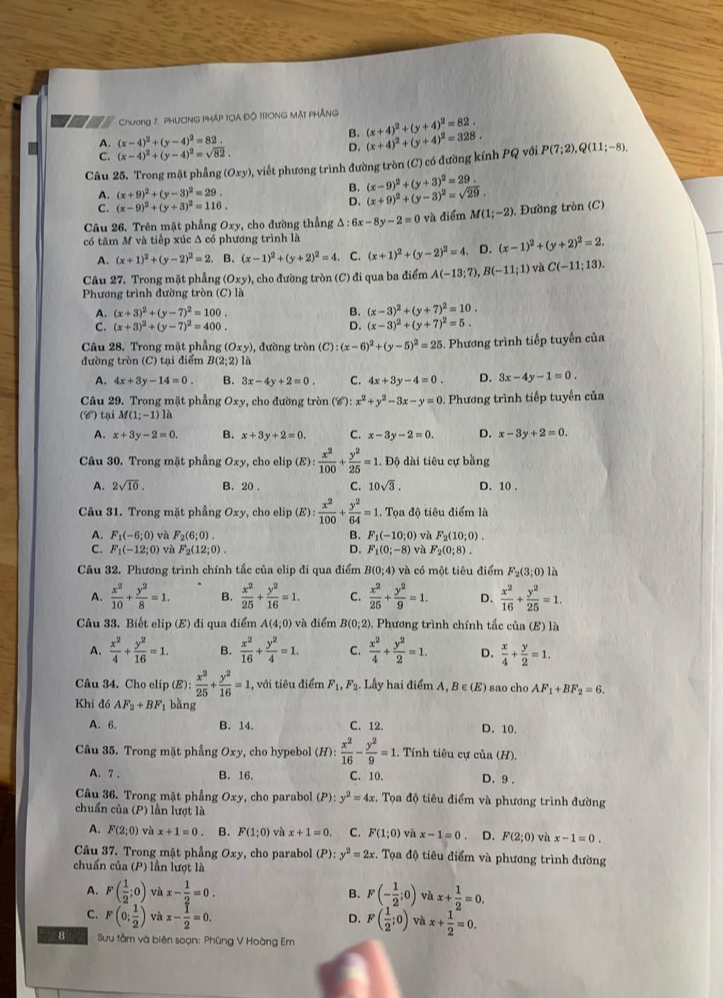 Câu 25. Trong mặt phẳng (Oxy), viết phương trình đường tròn (C) có đường kính PQ với P(7;2), Q(11;-8).