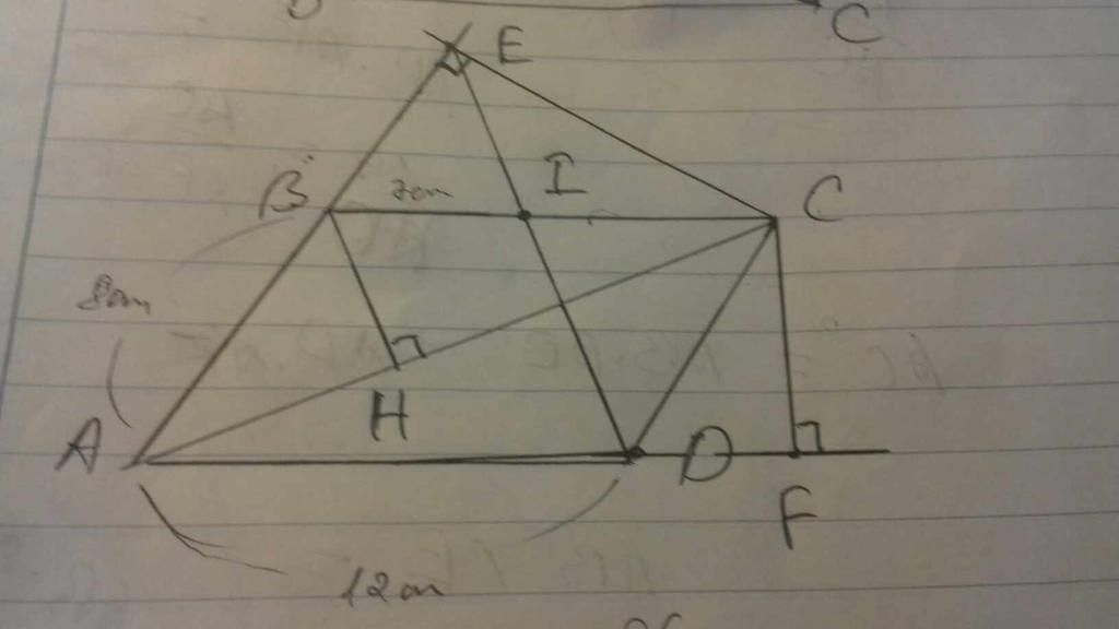Bài 2: Cho hình bình hành ABCD có AD = 12cm ; AB = 8cm. Từ C vẽ CE vuông góc với AB tại E, CF vuông góc với AD tại F và vẽ BH vuông góc với AC tại H. Nối E với D cắt BC tại I, biết BI = 7cm